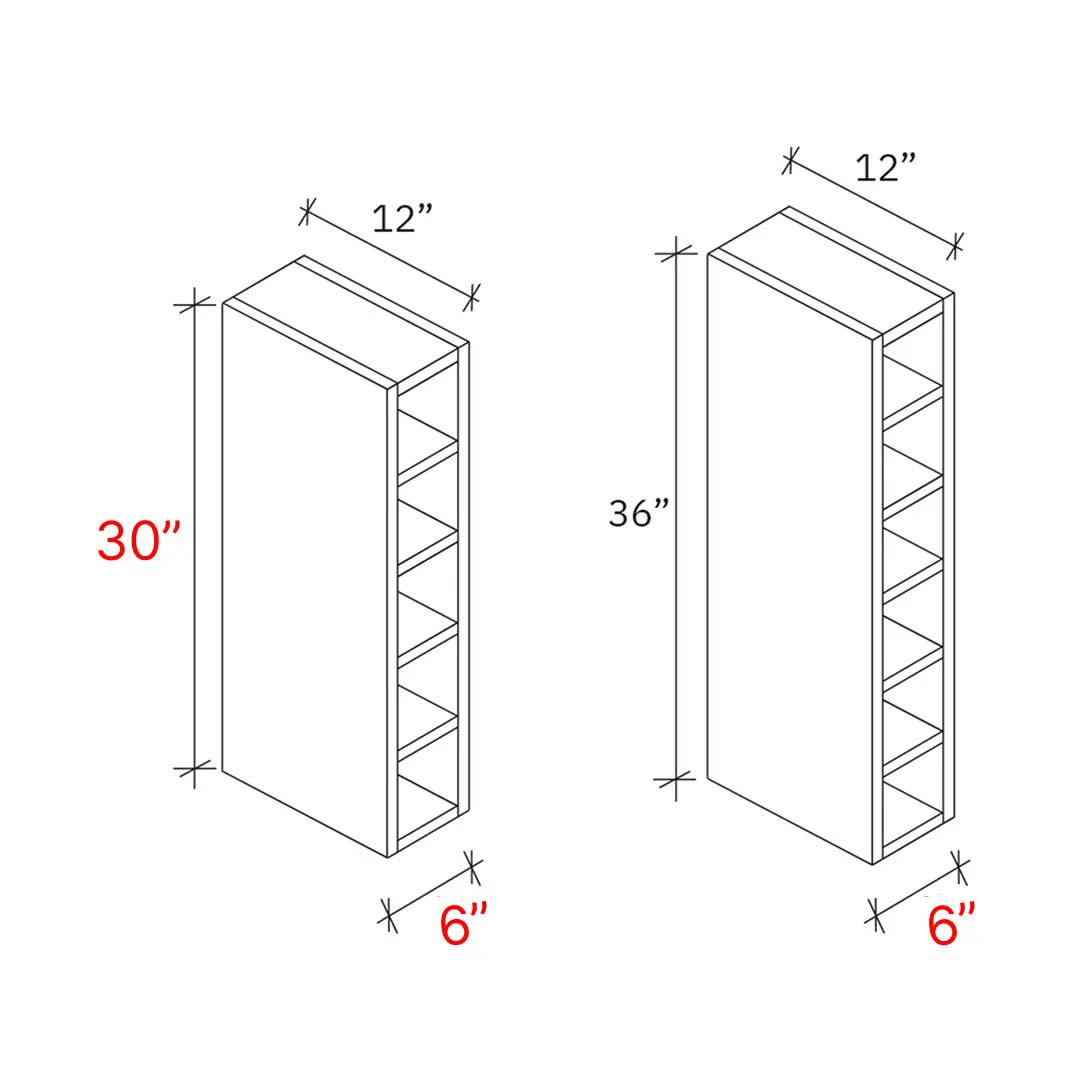The Shaker Natural Wine Cube, measuring 6″ wide, 30″ high, and 12″ deep, from RTA Cabinets is a versatile storage solution for wine bottles or other bottled beverages. Its compact cube design allows it to fit neatly within cabinetry, pantry spaces, or kitchen islands while keeping bottles organized and easily accessible.